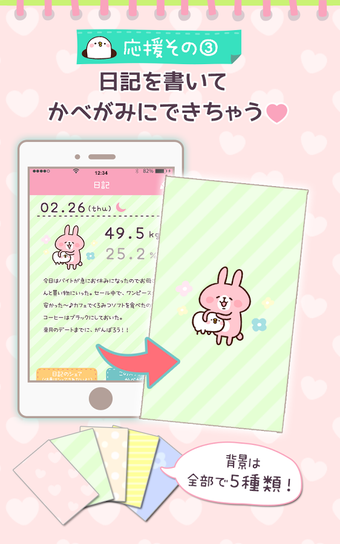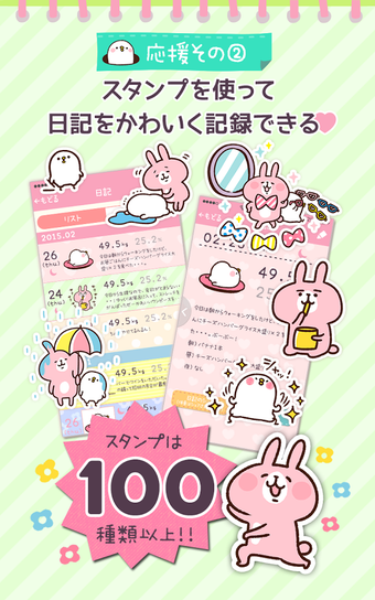 ゆるっとダイエット カナヘイの体重管理アプリは、イラストレーターのカナヘイさん作「ピスケ&うさぎ」と一緒に体重を記録していく楽しいダイエットアプリです。日記もつけられて、食事内容などのメモができます。体重記録と日記を続けていけばいくほど、壁紙としてダウンロードできるピスケ&うさぎのイラストが増えていき、ダイエットをするのが楽しくなります。
