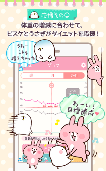 体重と一緒に食事内容など日々の生活を日記で管理したい、壁紙のご褒美付きで楽しくダイエットを続けたい、そう思ったらピスケ&うさぎと一緒にこのアプリでダイエットしてみませんか?